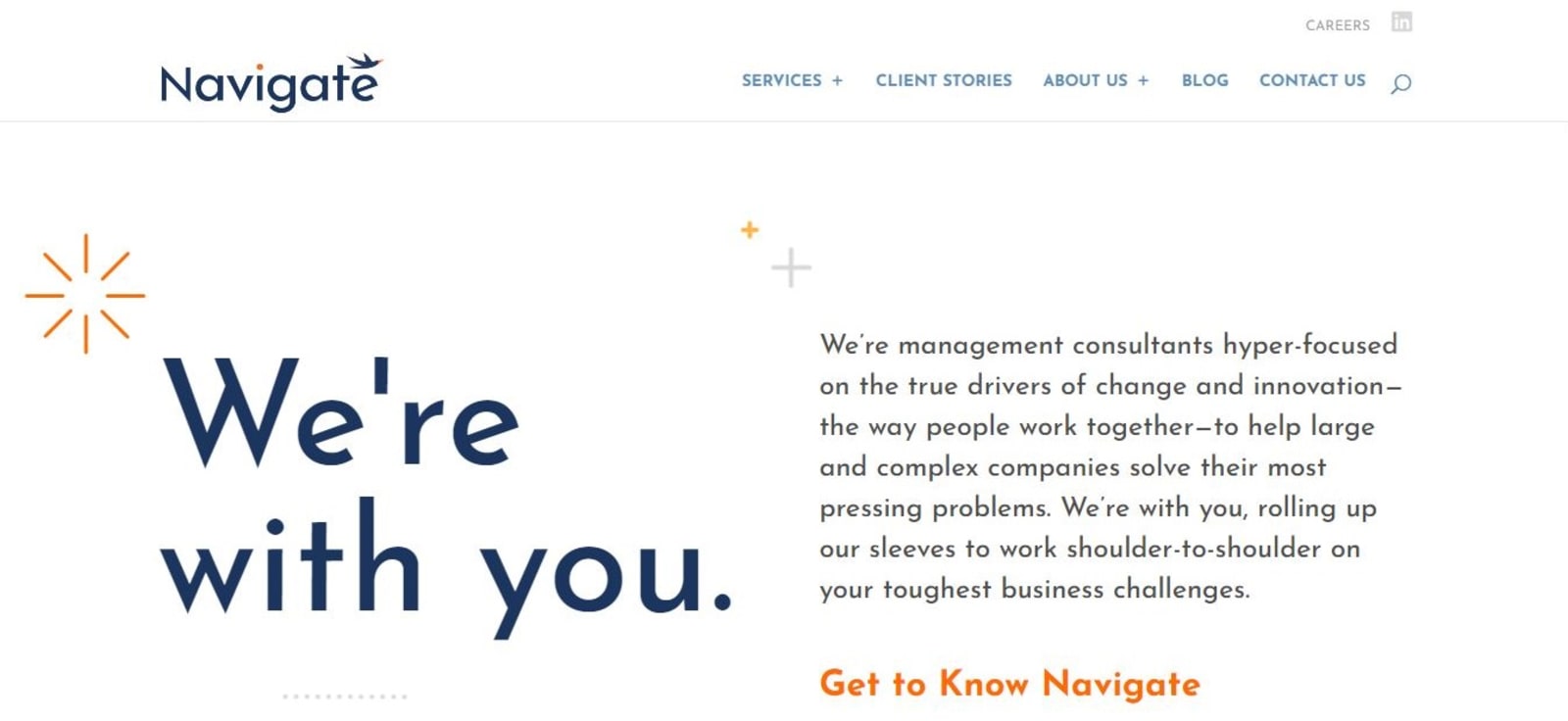 But despite working with large and complex companies, Navigate has a clean design. They also use lively color schemes in white, navy blue, and orange.