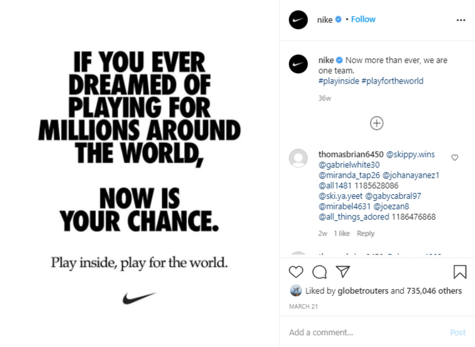 An example of this is the Play for the World campaign of Nike. This campaign had about 42,000 posts on Instagram and 33,000 retweets on Twitter. Nike used the hashtags #playinside and #playfortheworld that created a buzz among users.