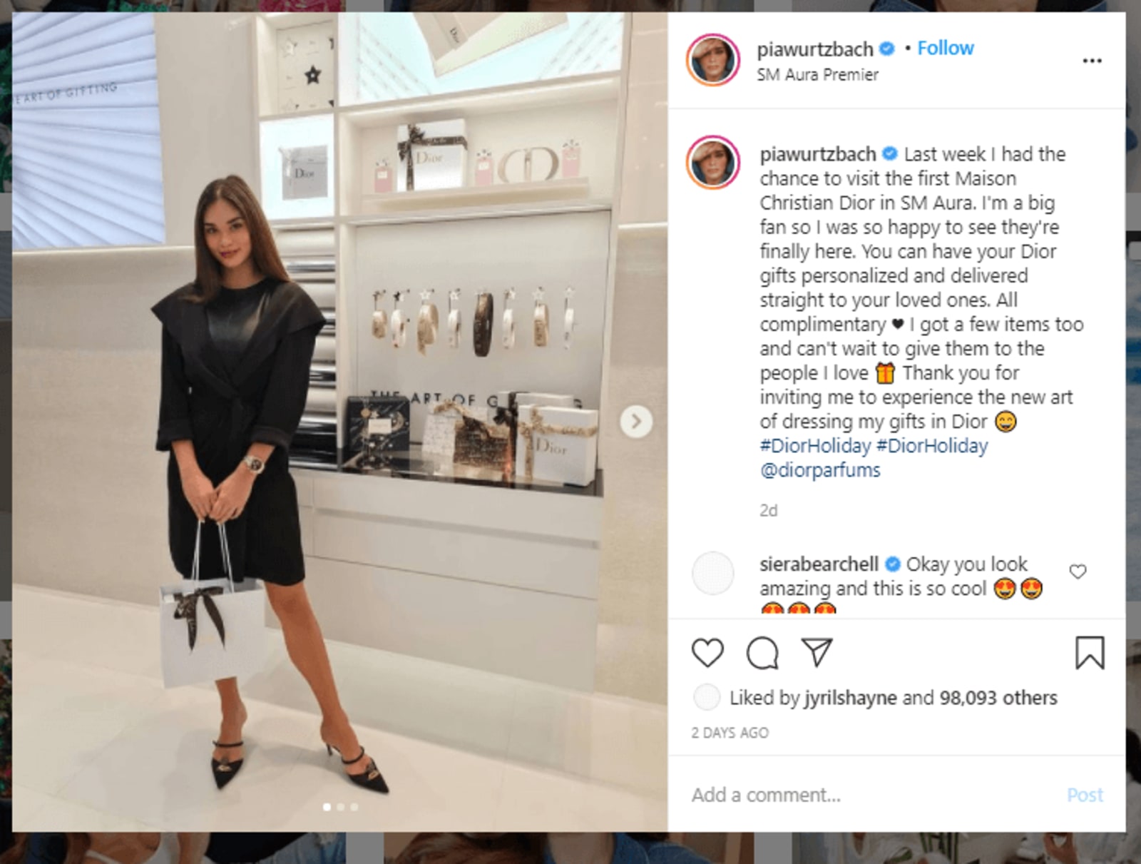 The beauty queen, Pia Wurtzbach, mentioned Dior on her Instagram post, with a #DiorHoliday tag. This post reached a large number of her followers, making them aware of a new option of how they can make their gifts personalized and delivered.