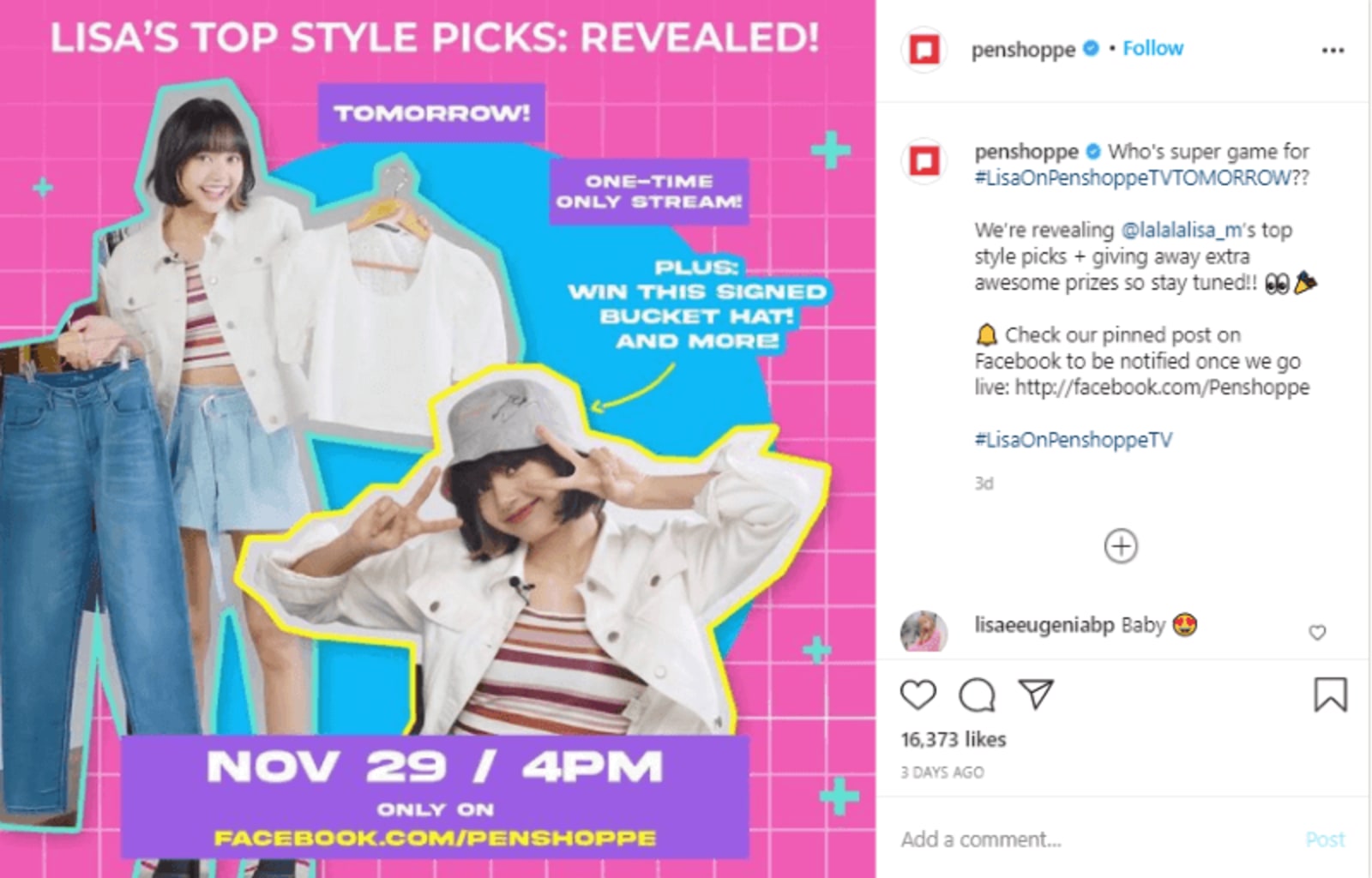 Penshoppe also posted this ad on Instagram, with KPop group Blackpink’s member Lisa. This post informed all viewers to watch a live broadcast to know about Lisa’s style picks.