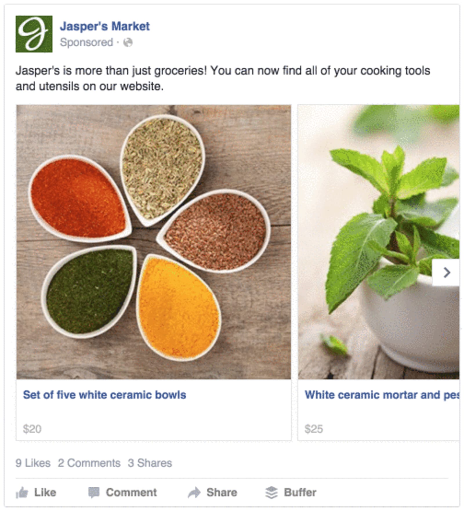 This is another social product ad format which lets brands feature images (or videos) of multiple products in one ad. Your users can swipe through the various slides of a carousel ad to see different items offered.