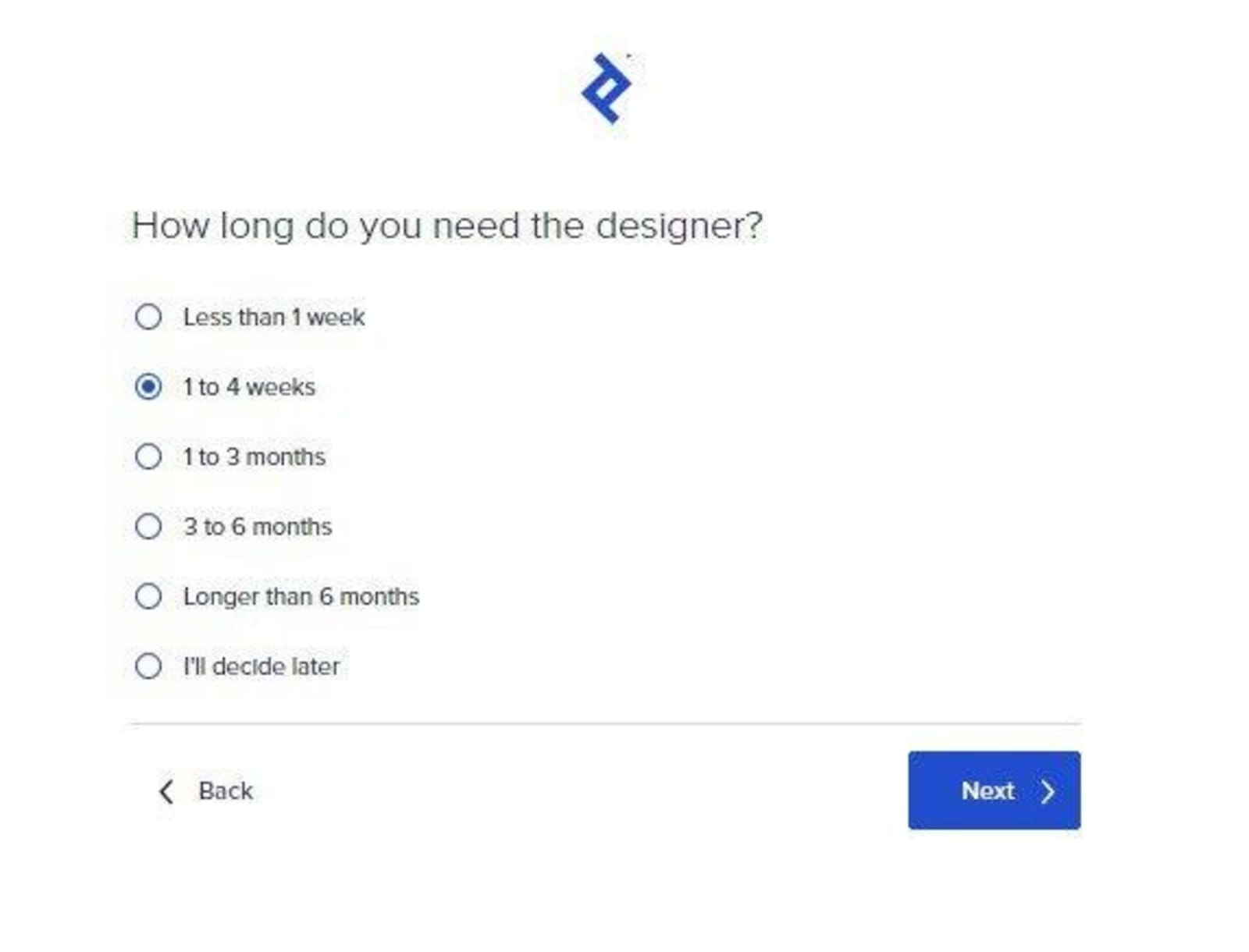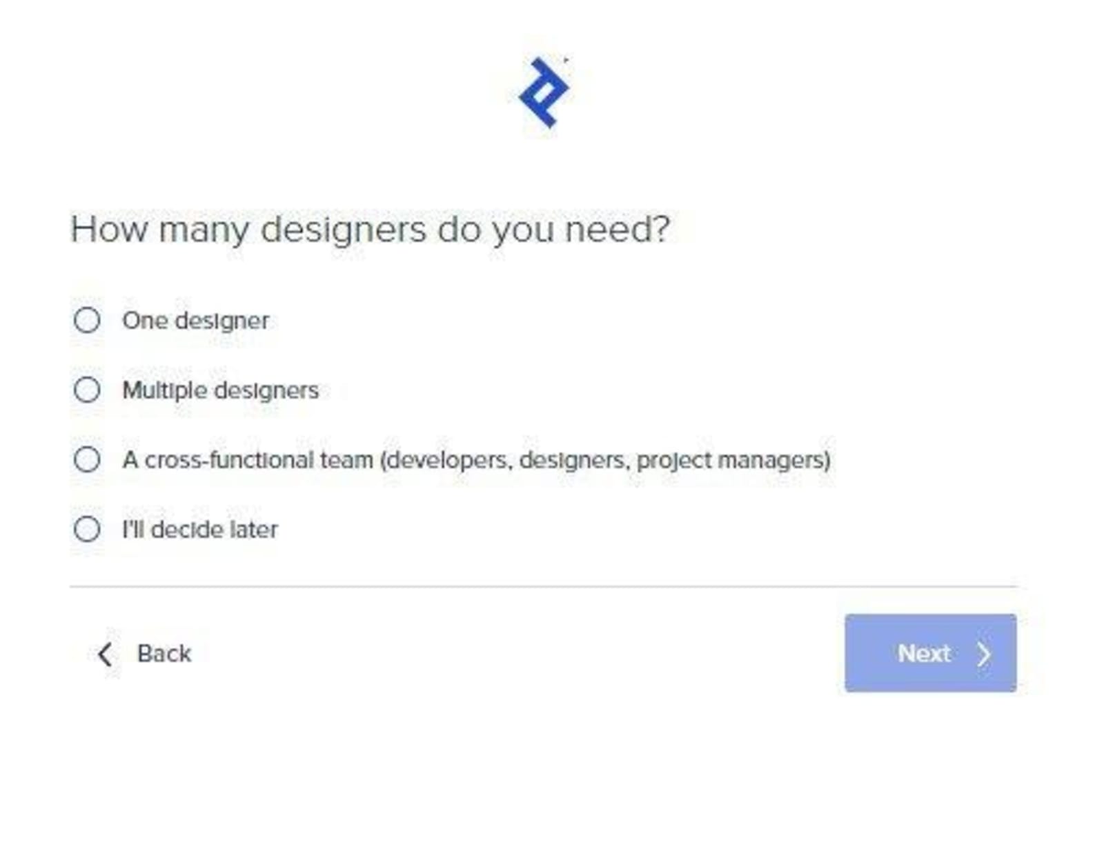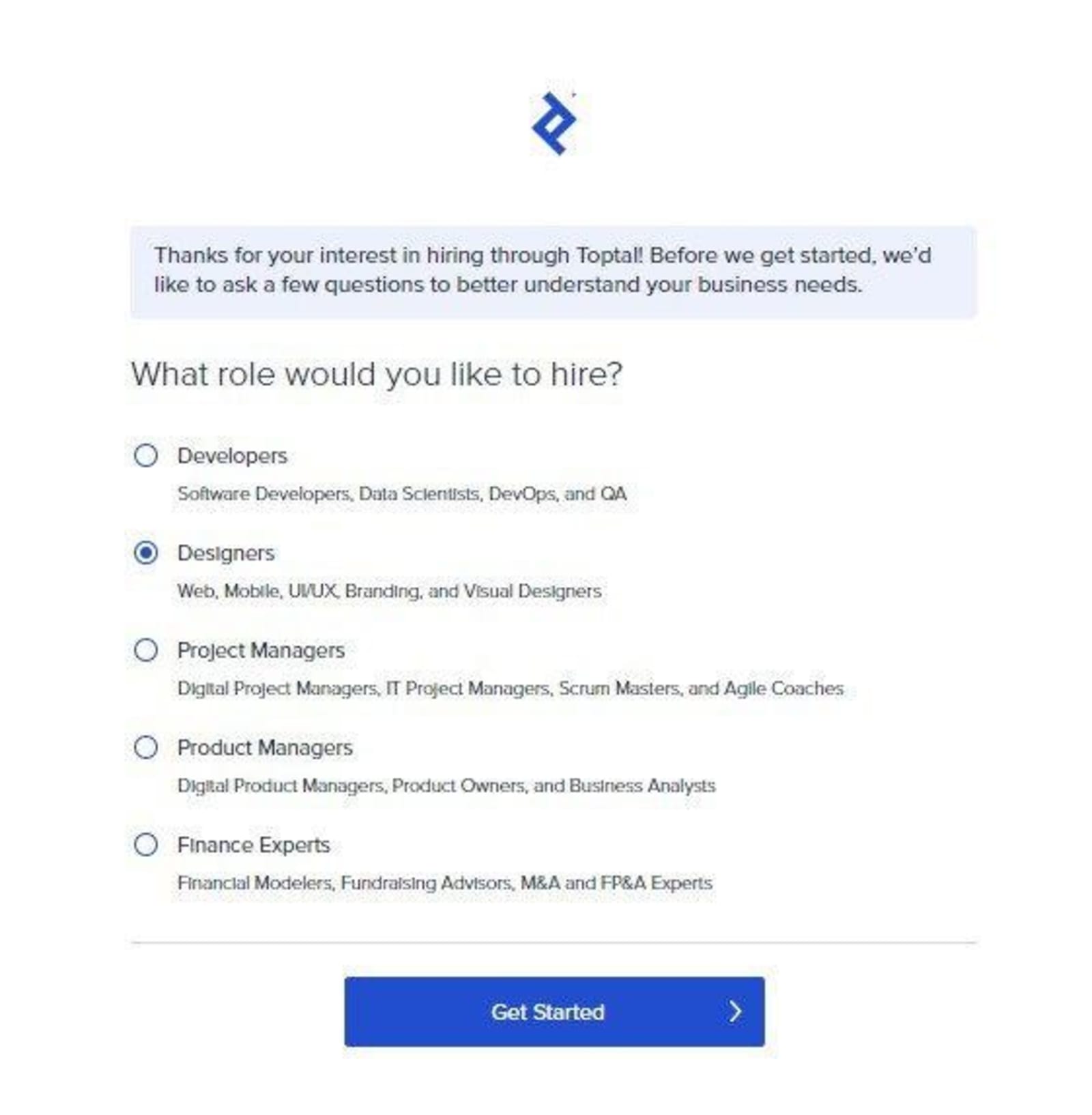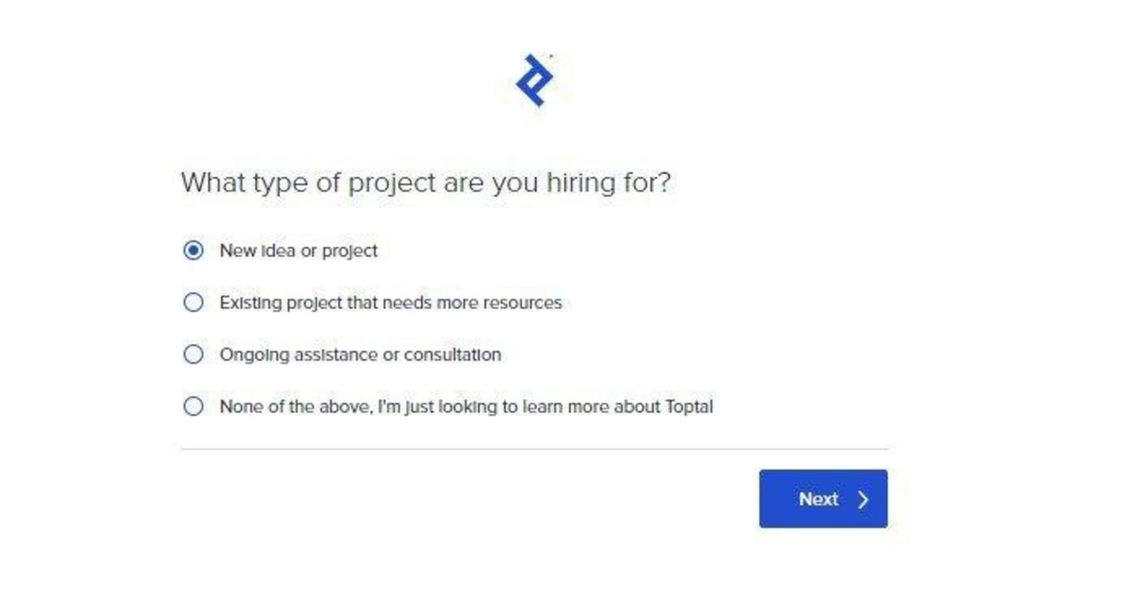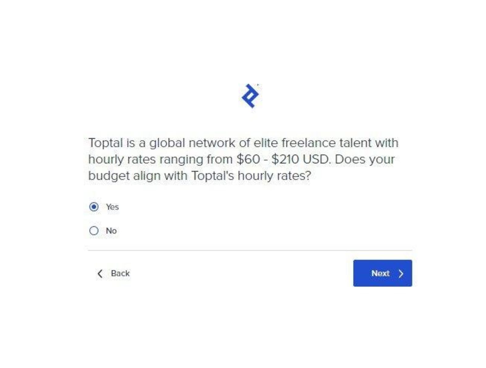 Now, Toptal has a completely different account creation process. Instead of filling our details first, we had to answer about 12 questions around the project and our company.