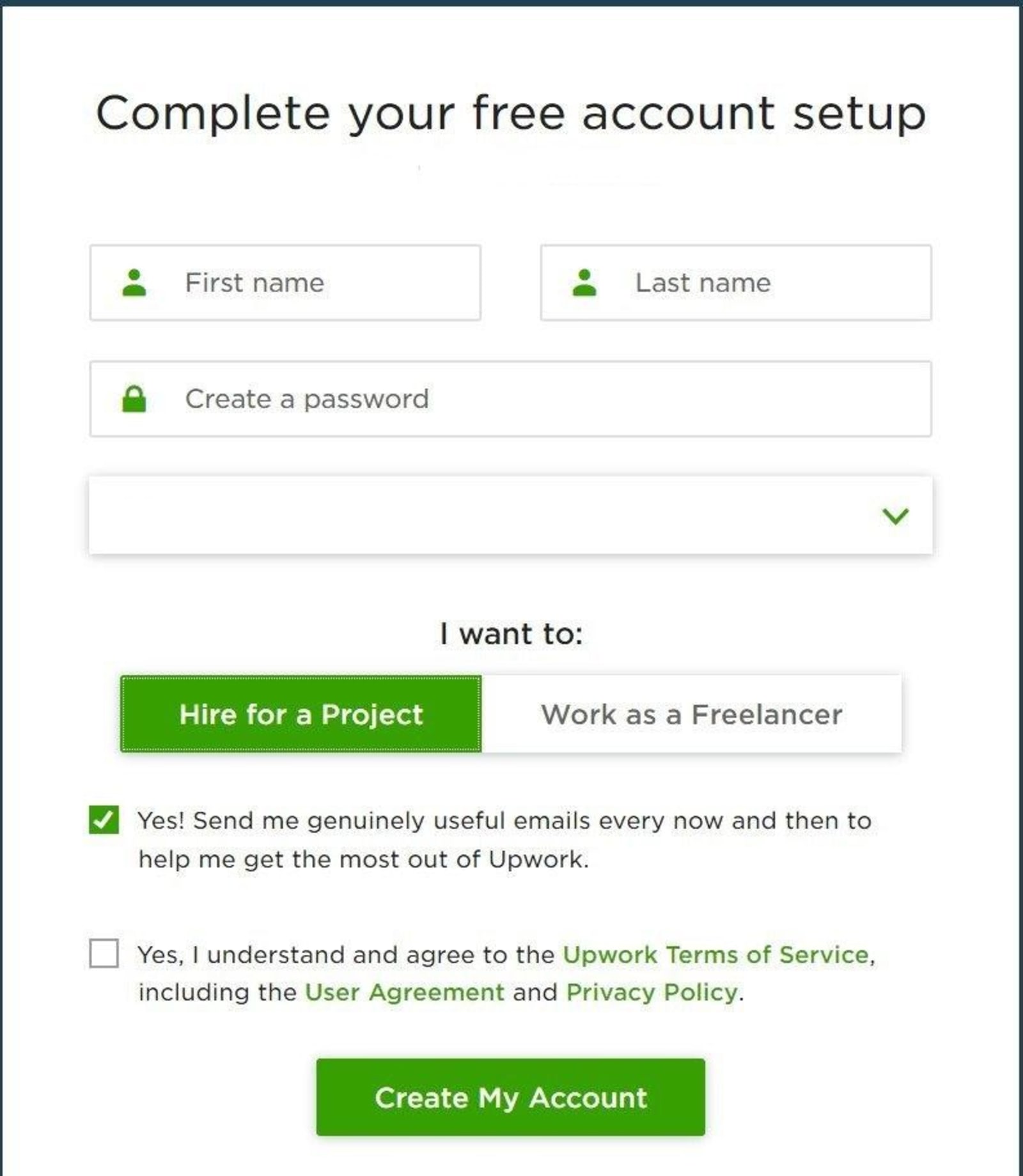 - Input your name, password, country and select the “Hire for a Project” option and get the account.