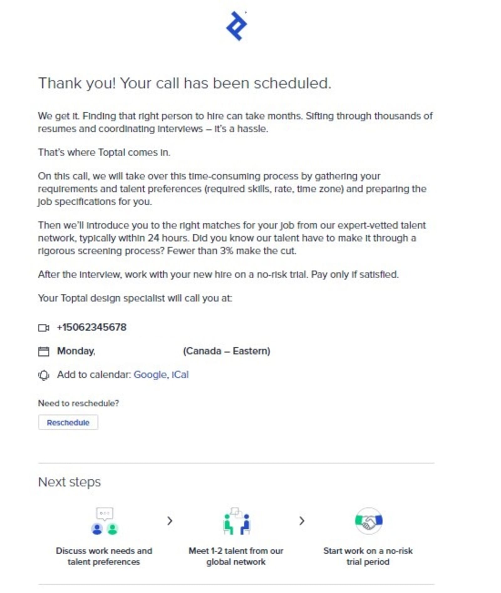 Filling the questionnaire also did not lead to account creation like in the Upwork process. Instead, we had to schedule a call with the Toptal Talent team. However, it is important to note that on both websites, account creation does not equal immediate access to job opportunities. We still had to cross another hurdle of applying to have our profile hoisted on both websites.