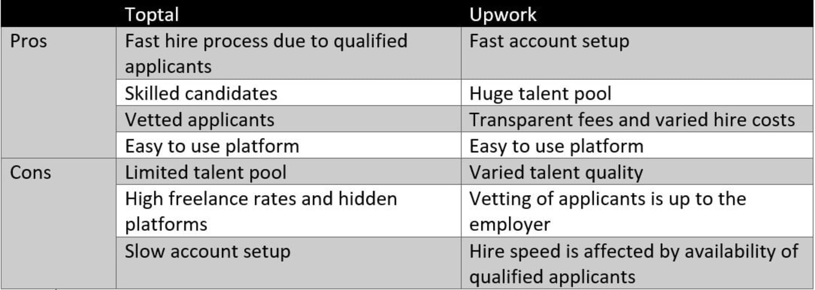 Toptal vs Upwork: Going through the graphic designer hire process on both platforms was as different as night and day. On Toptal the hiring process was effortless as most of the vetting had been done by the Toptal team. But, on Upwork, we were not only reviewing applications but had to put tests in place to vet the applicants to confirm their fit.